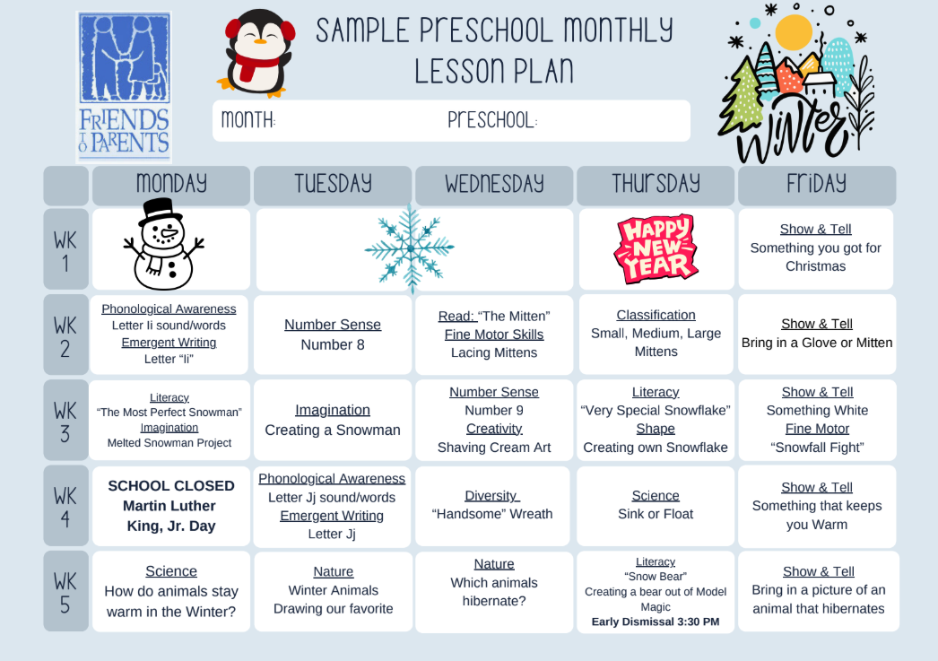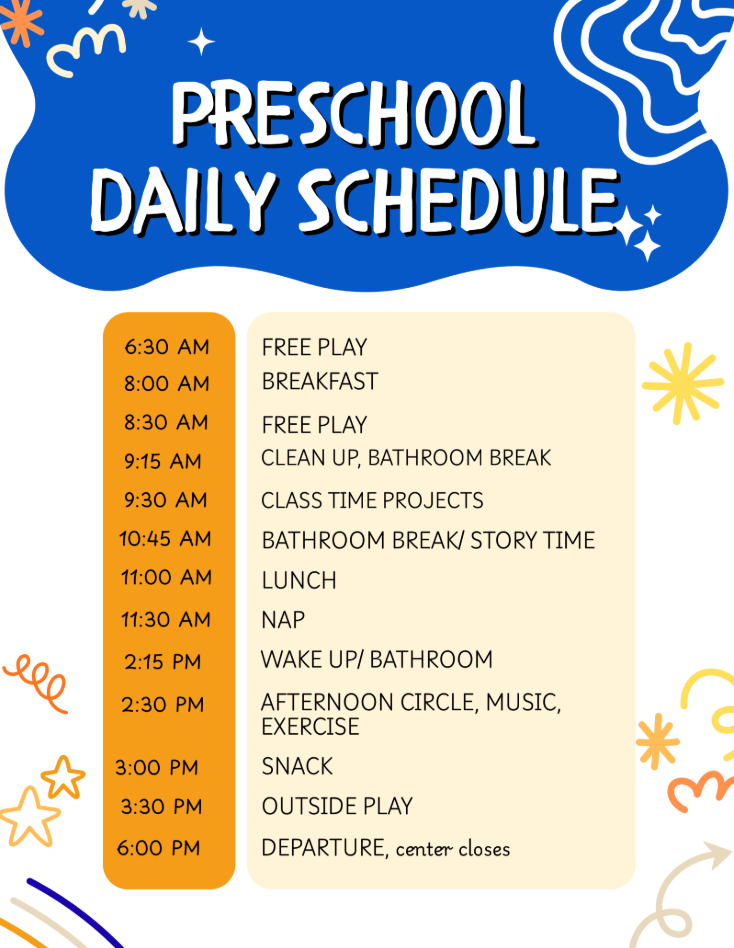 Our daily plan takes into account (1) activities that are based on age differences and individually since each child is unique (2) the physical, language, cognitive, emotional, social, intellectual, and self-help needs of the child. As a result, children gain a healthy self-image, beginning social skills, increased language abilities, large and small muscle control and self-help skills.